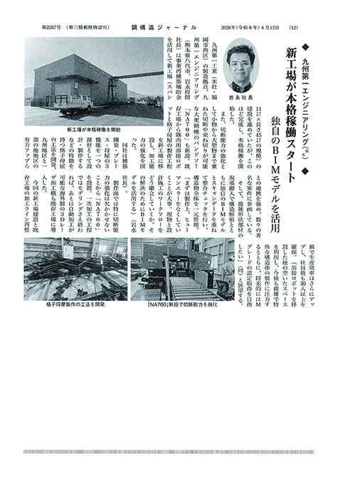 鋼構造業界の専門情報紙「週刊鋼構造ジャーナル(2026年4月13日発行)」に、九州第一エンジニアリング様の記事が掲載されましたので、ご紹介いたします。
